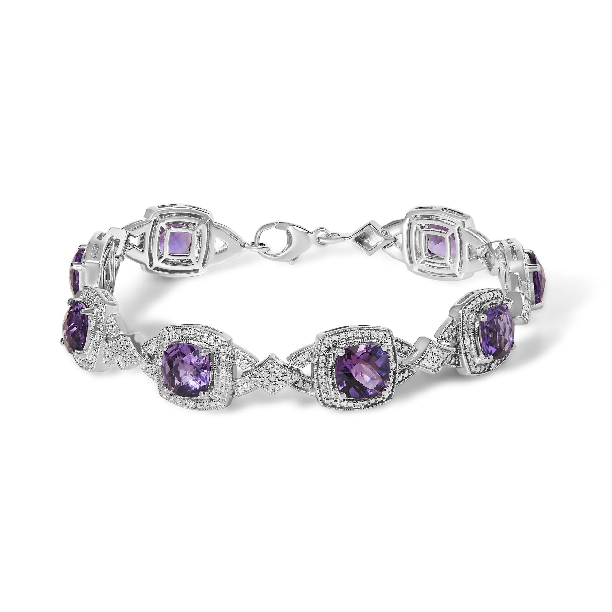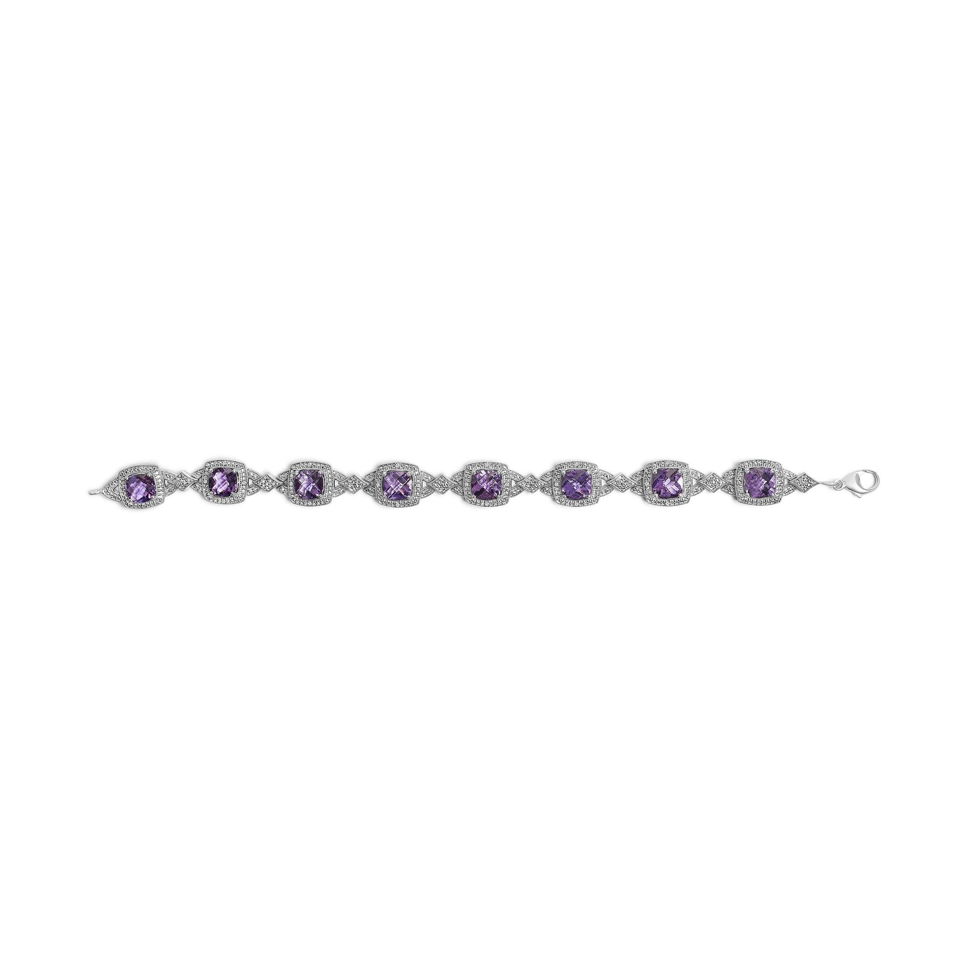 Draped in the splendor of rhodium-plated .925 sterling silver, this exquisite bracelet mesmerizes with its vintage halo link design—a testament to timeless elegance. Each natural purple amethyst, enchantingly cushion-cut with a checkerboard facet, measures a regal 5x7 mm. These gems, heat-treated to deepen their violet allure, are encircled by twinkling halos of natural diamonds. With colors spanning the I-J spectrum and clarity grades of I1-I2, the diamonds complement the mystical hue of the amethysts, creating a symphony of sparkle that wraps gracefully around wrists up to 7 inches. A secure spring ring clasp ensures this piece's enduring place on your wrist, symbolizing a legacy of enchantment and grace.