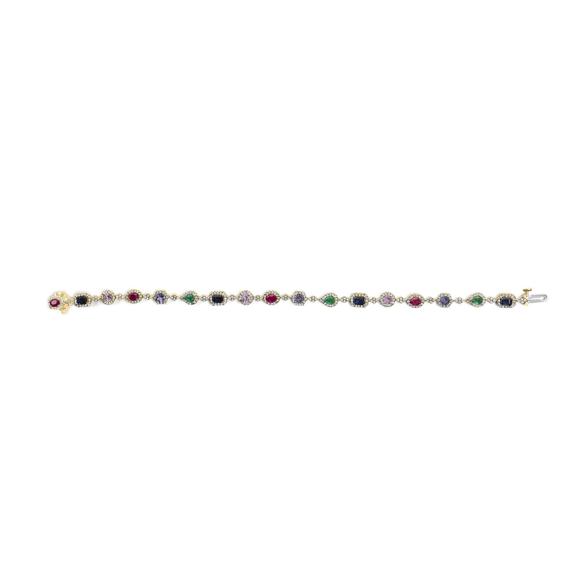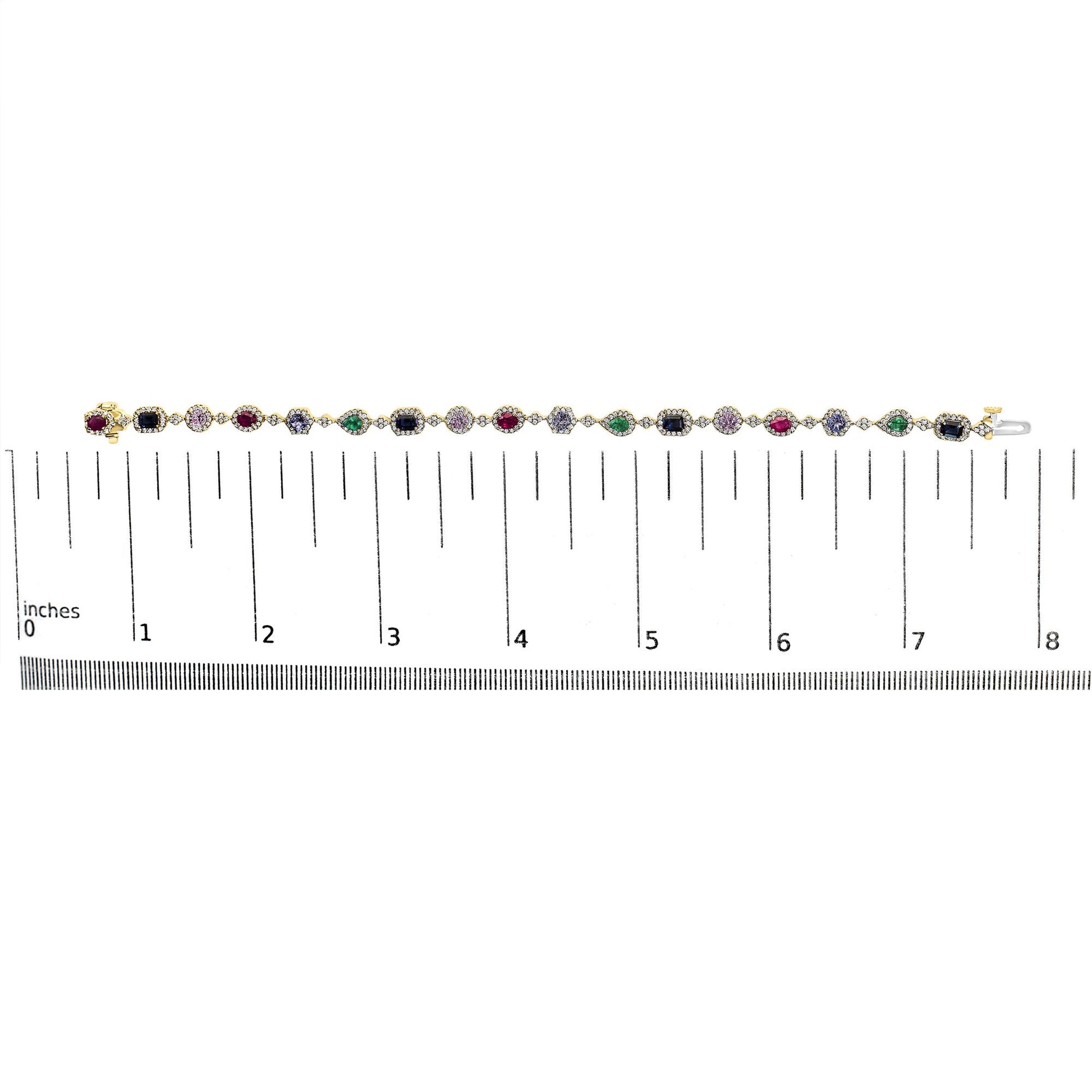 Embrace a spectrum of vivid elegance with this 14K yellow gold bracelet, elegantly crafted to enchant with a kaleidoscopic array of heat-treated natural gemstones surrounded by halo settings of 313 sparkling diamonds, totaling 1 carat. Among these are lustrous pear-cut emeralds, rich oval-cut rubies, and deep blue emerald-cut sapphires, complemented by round tanzanites and pink sapphires, each gem measuring a harmonious 4mm. The gems are intricately connected by delicate kite-shaped links, ensuring graceful movement and an ethereal flow around the wrist. This masterpiece is secured with a sturdy push-release open box clasp, designed for wrists up to 7 inches, offering not just a stunning visual experience but a promise of lasting allure. Whether donned for a celebratory occasion or as a signature daily wear, this bracelet promises to be a conversation starter and a treasure in your collection.