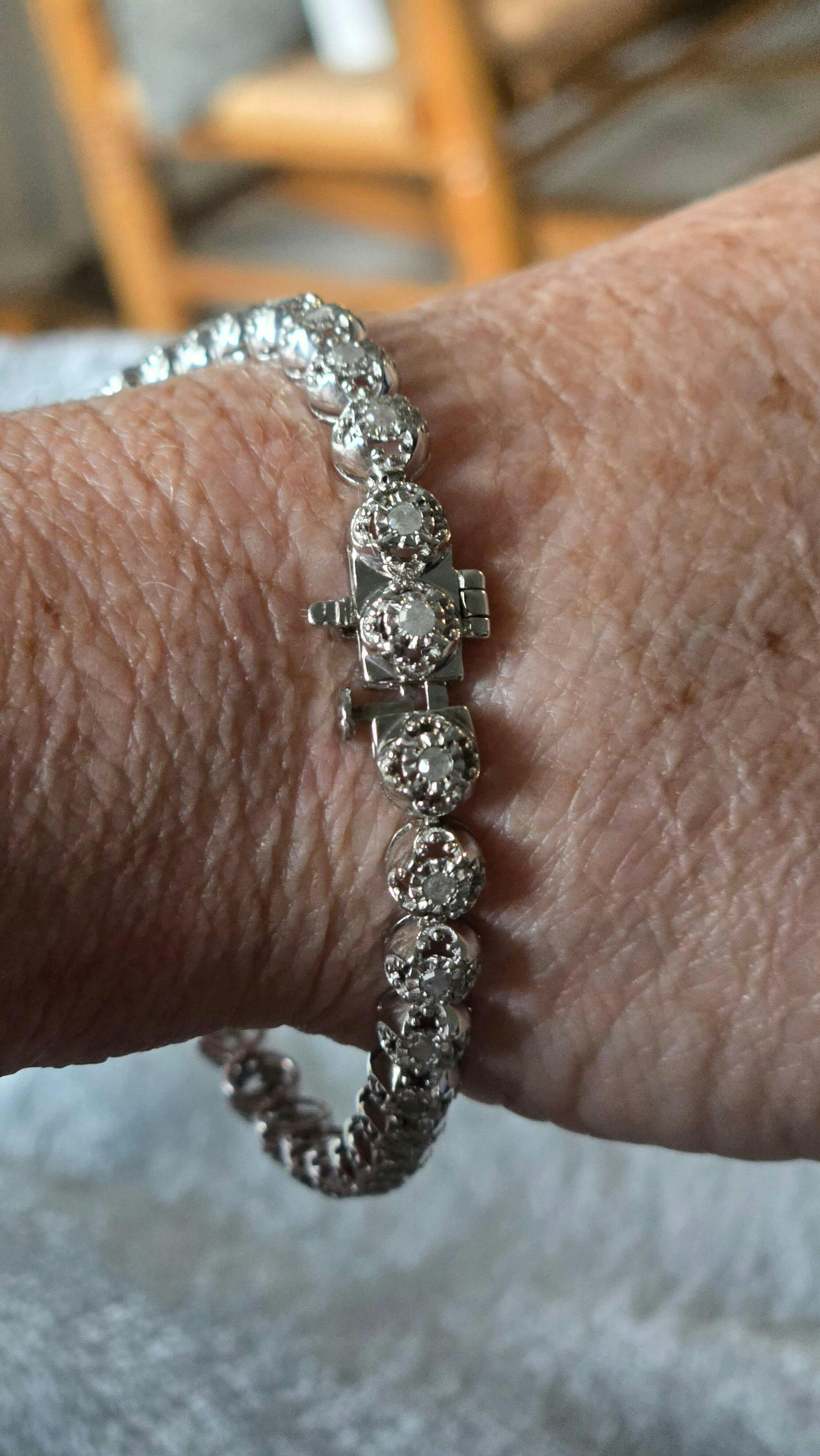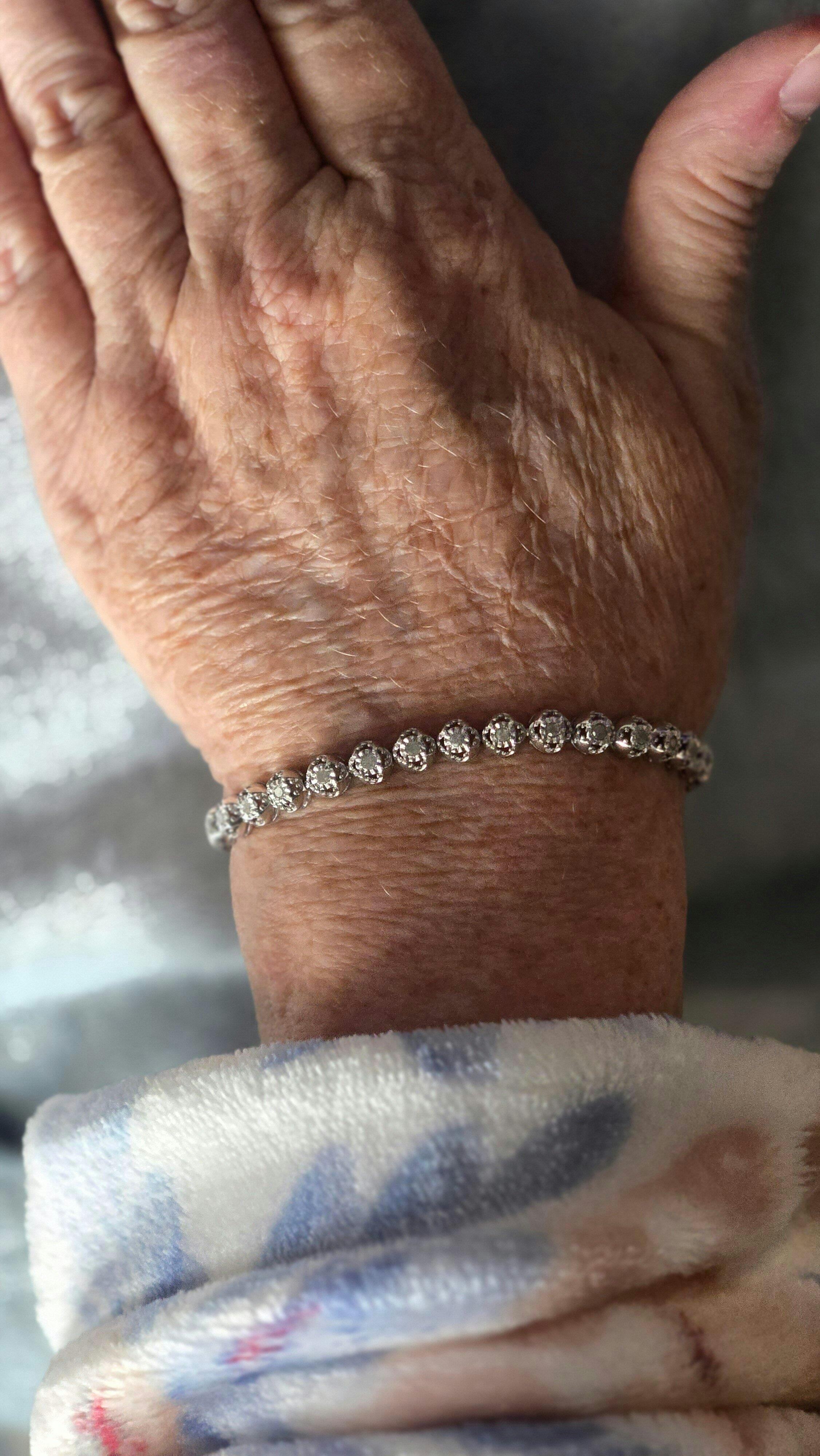 Elegant and timeless, this sterling silver link bracelet features 1.0 carat total weight of round, rose cut, promo quality diamonds with 32 stones in all. The tennis bracelet features round links with illusion set diamonds in our unique miracle-plate setting, which centers each diamond in a mirror-finish, high-polish frame that gives the illusion of a much larger stone. Each stone is centered with petals of silver folding in creating a recessed quatrefoil flower shape. Rose-cut, promo quality diamonds are milky and cloudy in nature. The 7” bracelet fastens with a box clasp and is crafted of real 92.5% sterling silver that has been electro-coated with genuine rhodium (a platinum-family metal), ensuring it will keep a tarnish-free shine for years to come. This classic tennis bracelet makes a great gift for any special occasion! Whether worn for daytime glamour or evening sparkle, this bracelet is gorgeously versatile. Give her a gift that will perfectly complement her favorite ensemble.